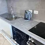 In diesem 65 m^2 großen Apartment finden Sie eine komplette Küche.